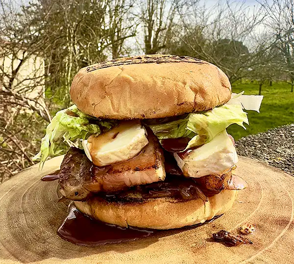 Une création douce et relevée : cheddar, bacon, salade, oignons frits, mayonnaise à l’échalote maison.